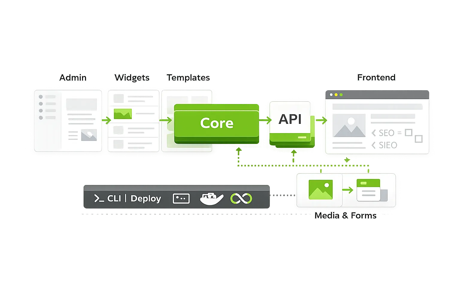 LukVerse CMS to modułowy, headless system zarządzania treścią budowany jako wspólny fundament pod kolejne wdrożenia webowe. W praktyce obejmuje panel administracyjny, publiczny frontend renderowany z treści CMS oraz backend API, który spina dane, konfigurację i publikację.